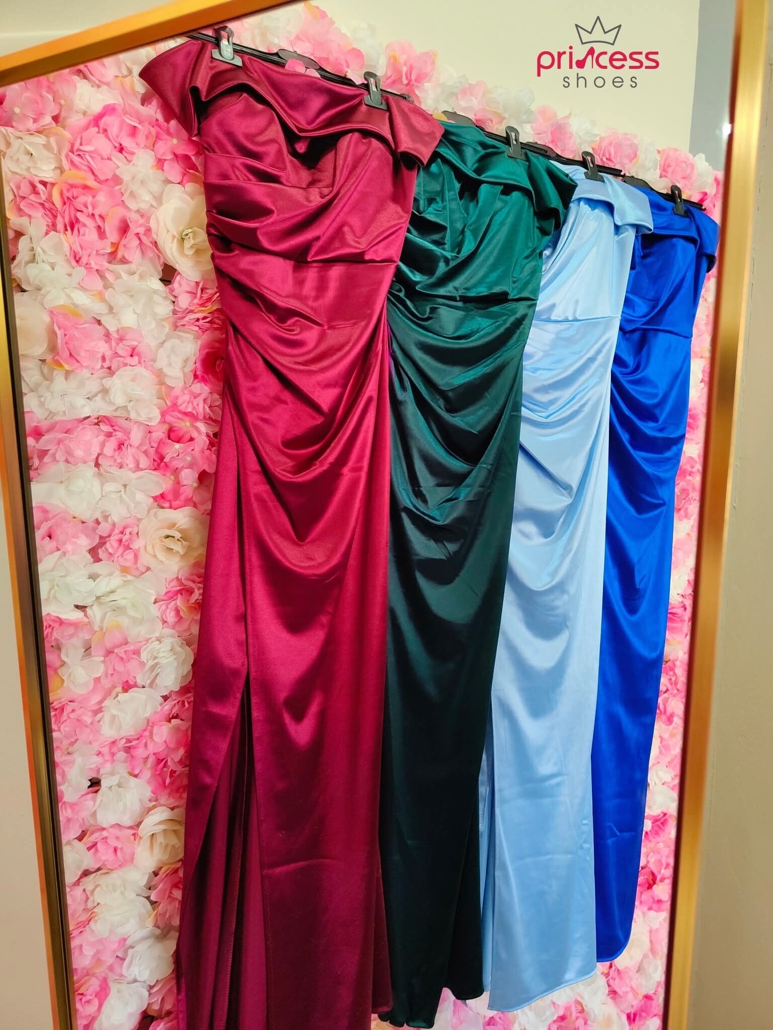 Il design è caratterizzato da una scollatura che abbraccia le spalle, lasciandole parzialmente scoperte, ma con un drappeggio che si sviluppa lungo la parte superiore del corpo, creando una forma sinuosa e affusolata.